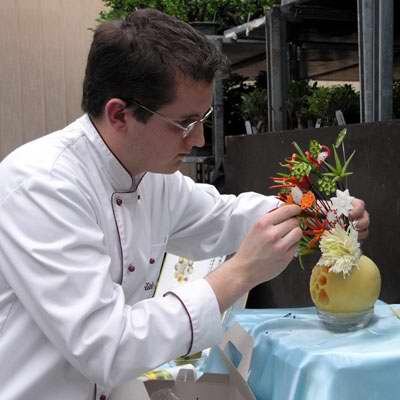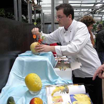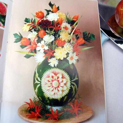 Aranžování vyřezaných květin do vyřezané vázy vázy z melounu |