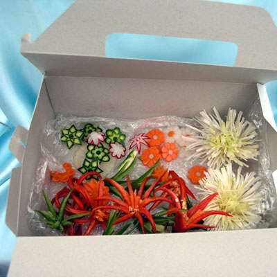 Vyřezané květy z paprik, mrkve, pórku, cukety, ředkvičky, ... |